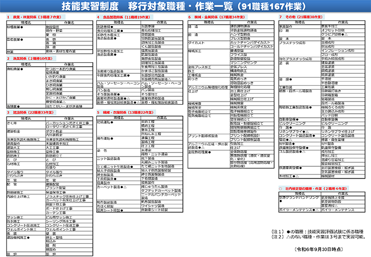 技能実習制度 移行対象職種・作業一覧(91職種167作業)