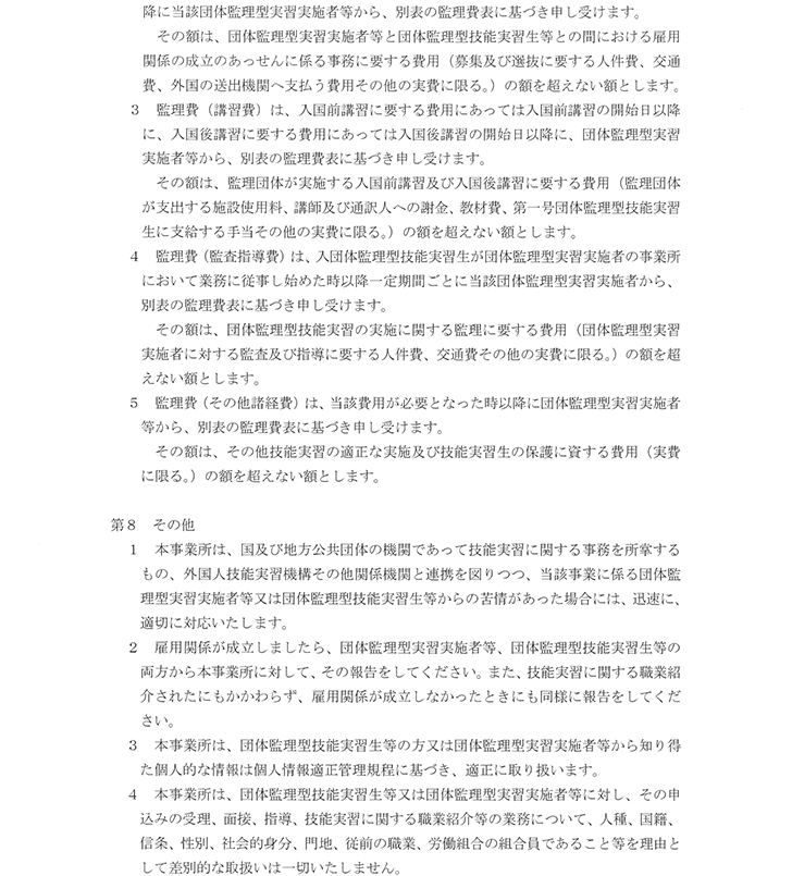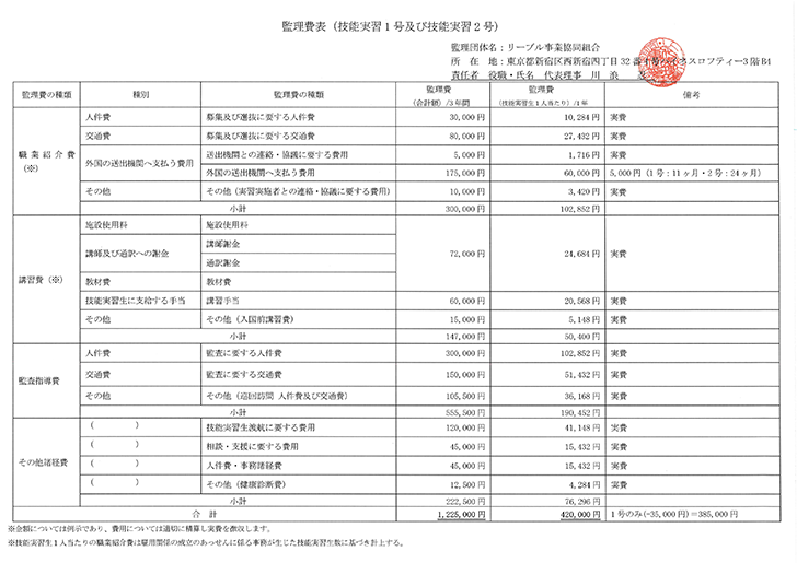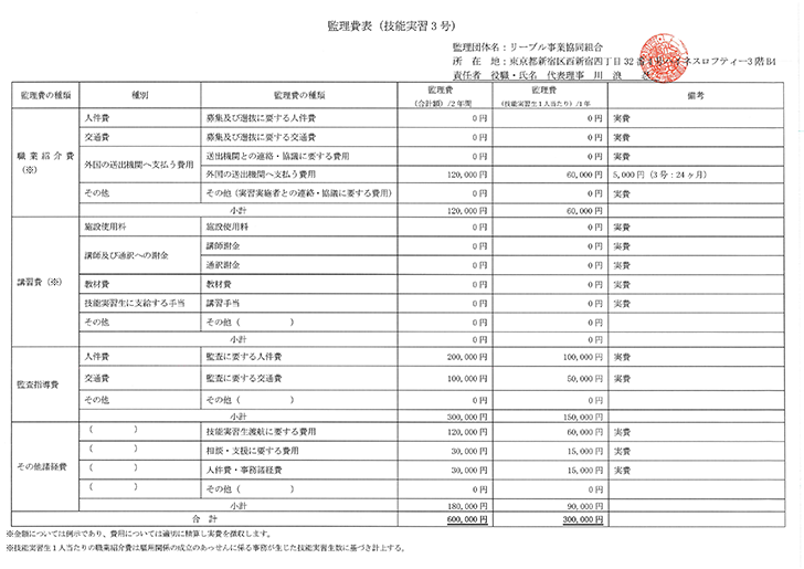 監理費表(技能実習1号表及び技能実習2号、技能実習3号)