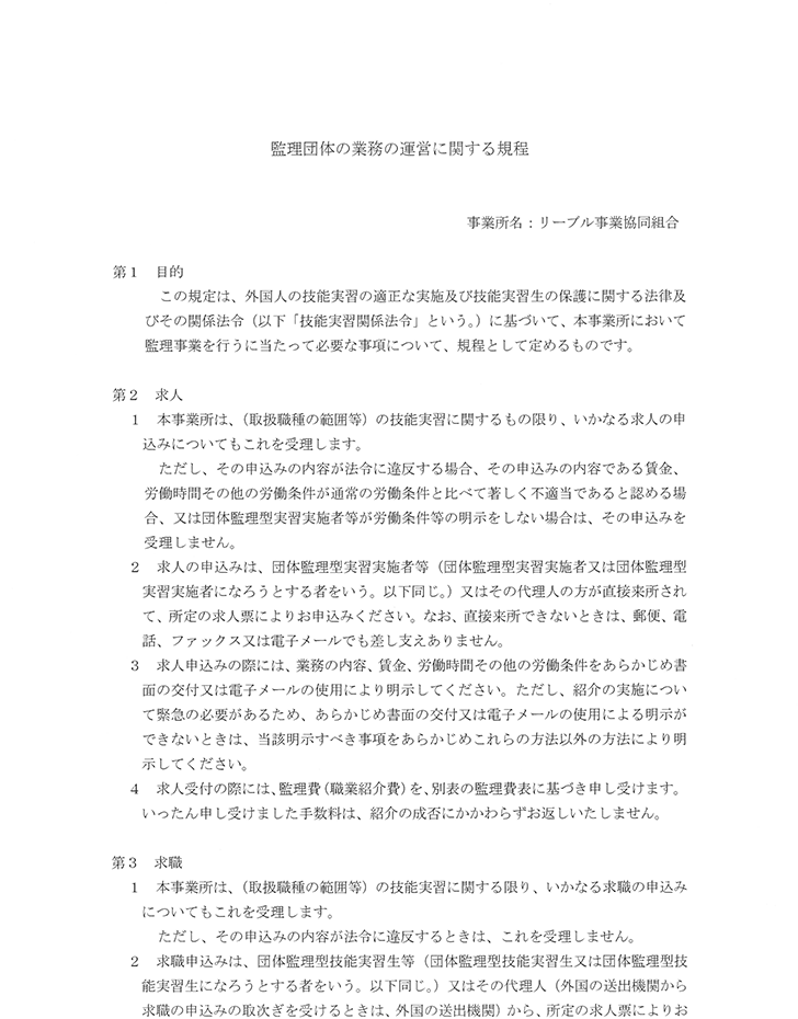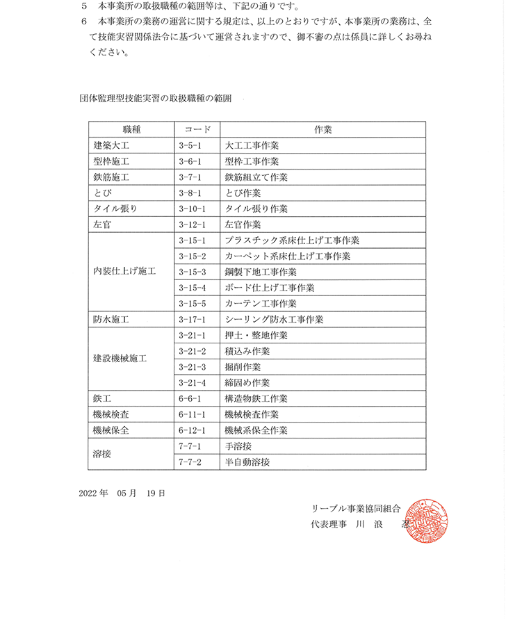 我が国で開発され培われた技能・技術・知識の開発途上国等への移転を図り、当該開発途上国の経済発展を担う「人づくり」に寄与することを目的とし、技能実習を計画的・段階的に修得させるための技能実習計画に従って事業を行って参ります。